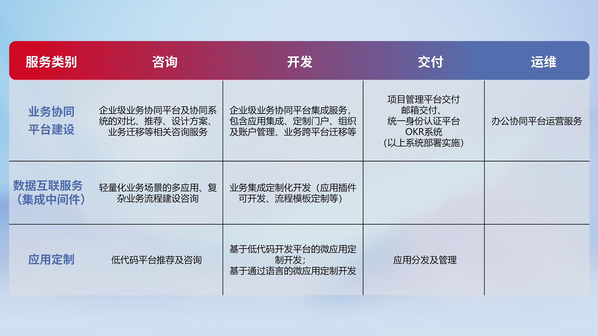 针对钉钉、、、企微、、、IDaas等平台级产品提供产品的规划、、、方案、、、、交付、、、定制化开发等服务,,,实现如统一协同办公、、、智能客户服务、、混合会议管理、、、智能数据查询、、、、等业务场景,,,,实现数字化转型。。。。